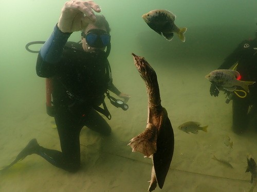 Located in Highlands County, Fl., Lake Denton is a 66 acre fresh water lake which has a hard, white sandy bottom and reaches depths of 55 feet. For a lake in Florida, the water is fairly clear with up to 30 feet of visibility. There are lots of bluegills, bream, large mouth bass and turtles that inhabit the lake. There are several sunken boats, man-made platforms and statues for divers to find and explore. Lake Denton is a popular training site and instructors from all over Florida bring their students to this location. There are no bathrooms at the lake but there a Port-A-Johns and a small changing room.